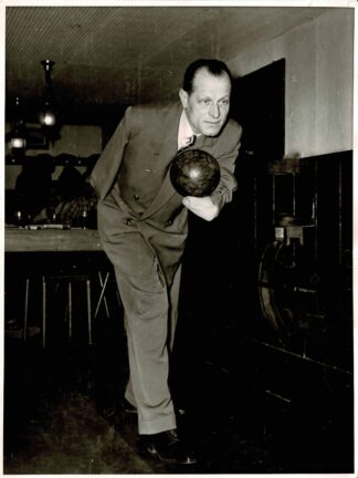Press photograph of B. Schmitz-Hochburg bowling with no hands